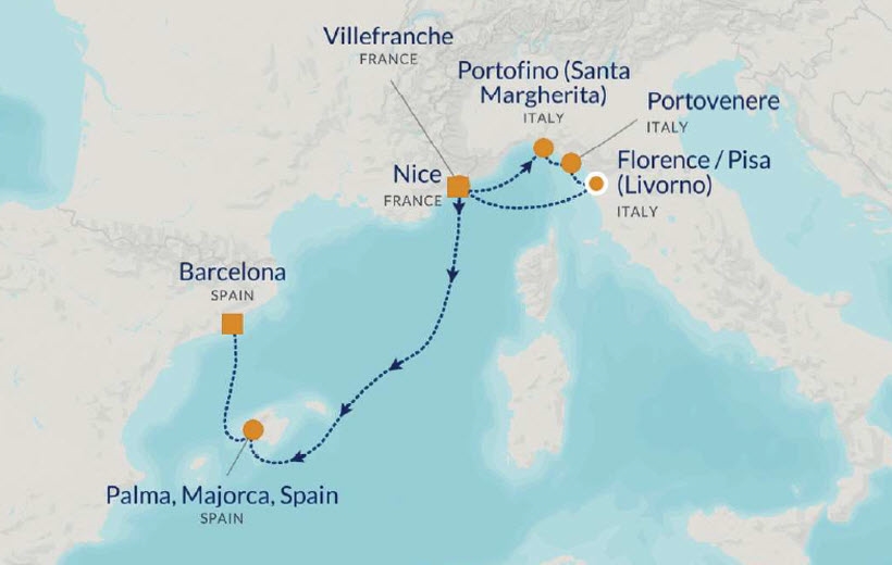 Niza (Francia), Portofino ((Santa Margherita), Italia), Portovenere (Italia), Florencia / Pisa ((Livorno), Italia), Florencia / Pisa ((Livorno), Italia), Villefranche (Francia), Palma de Mallorca (España) y Barcelona (España)