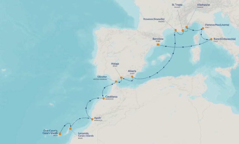 Gran Canaria, Islas Canarias (España), Lanzarote, Islas Canarias (España), Agadir (Marruecos), Casablanca (Marruecos), Gibraltar (Reino Unido), Málaga (España), Almería (España), Provenza ((Marsella), Francia), Saint-Tropez (Francia), Villefranche (Francia), Florencia / Pisa ((Livorno), Italia), Roma ((Civitavecchia), Italia), Barcelona (España)
